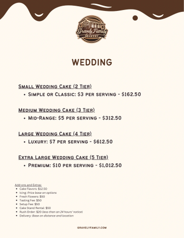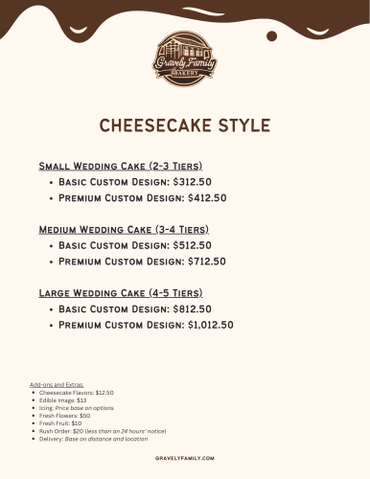 We're a made-from-scratch bakery, utilizing the best-crafted wedding cakes and cheesecake-style wedding cakes. All our cakes are made to order and never frozen. Our tired cakes have a very special way of being created in your vision. Here at Gravely Family Bakery, you'll find a little love in everything we prepare. Our best subtle flavors, moist textures, or the fact that we use a very special ingredient that has you coming back for more with a smile to light up any face.